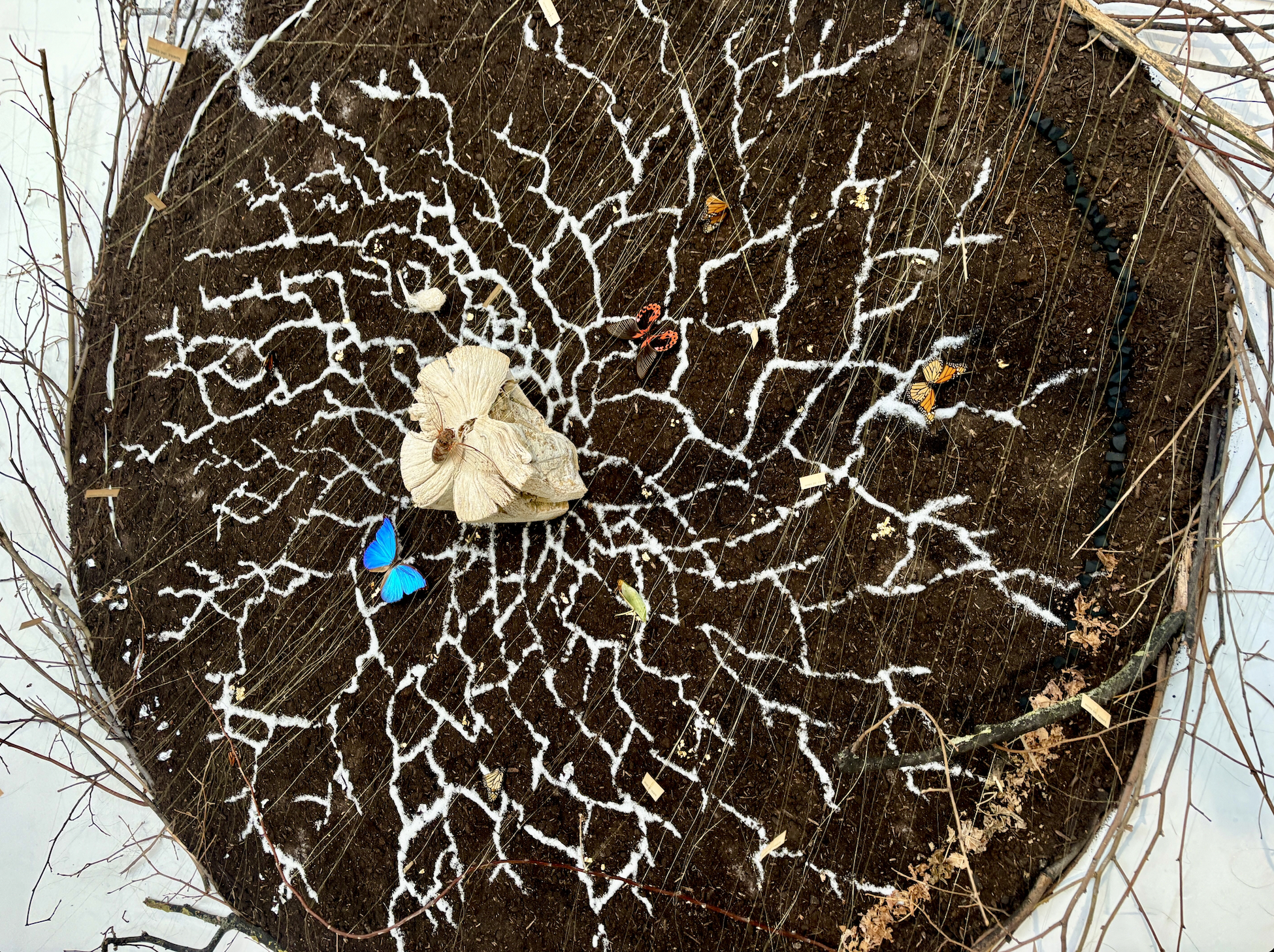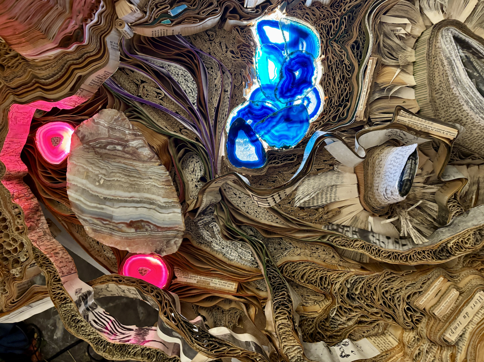 recycled books, apple seed, tree bark, snake skeleton, LED lights, fossils, geodes, precious stones, insects, amber, scorpion, crab, dirt, tree mushroom, salt, crystallised cicada, branch